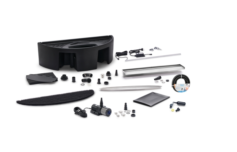 - Perfekt aufeinander abgestimmte Wasserfall-Sets: inklusive Pumpe, Reservoir, Wasserfall, Beleuchtung, Silent Splash zum Spritzschutz sowie Anschlussmaterial