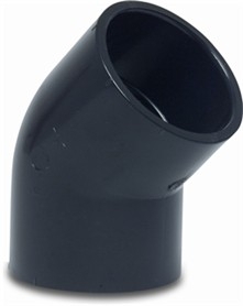 Der Winkel 45° aus PVC-U verwendet Klebemuffen zur Verbindung und ist für einen maximalen Druck von 16 Bar ausgelegt.