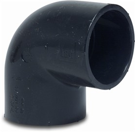 Der Winkel 90° aus PVC-U verwendet Klebemuffen zur Verbindung und ist für einen maximalen Druck von 16 Bar ausgelegt.